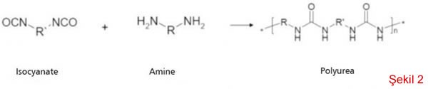 Püskürtmeli kaplama teknolojileri arasında oldukça yeni bir metod olan poliüre bundan yaklaşık 20 yıl kadar önce pazara tanıtıldı. Poliüre elastomerleri mükemmel fiziksel (Şekil 1) ve mekanik özelliklerinin yanı sıra aşınmaya karşı dayanımı ve yüksek ısıl kararlılık gibi özellikleri ile endüstriyel kaplamalarda tercih edilir oldu. Poliüre kaplama ya da elastomer ürünleri izosiyanat ile amin içerikli reçinenin tepkimeye girmesiyle oluşur. (Şekil 2) İzosiyanat tarafı aromatik ya da sararmayan uygulamalar için alifatik olabildiği gibi monomer ya da prepolimer şeklinde de sistemlerde bulunabilir. Püskürtmeli poliüre uygulamasının en önemli özelliği çok hızlı, öngörülebilir ve tepkimenin her tür sıcaklık ve rutubetli ortamda tutarlı bir şekilde sonuçlanmasıdır. Buna karşılık sprey poliüretan elastomerler aynı hızda tepkimeye girmesi için çok yüksek oranda katalist ilavesi yapılması gerekmektedir. Bu sayede benzer uygulama süresine yaklaşılsa bile malzemenin bozulmasına neden olacak geri tepkime de hızlanmaktadır. Ayrıca sprey poliüretan sadece kısıtlı sıcaklık ve rutubet aralıklarında uygulanabilmektedir.
